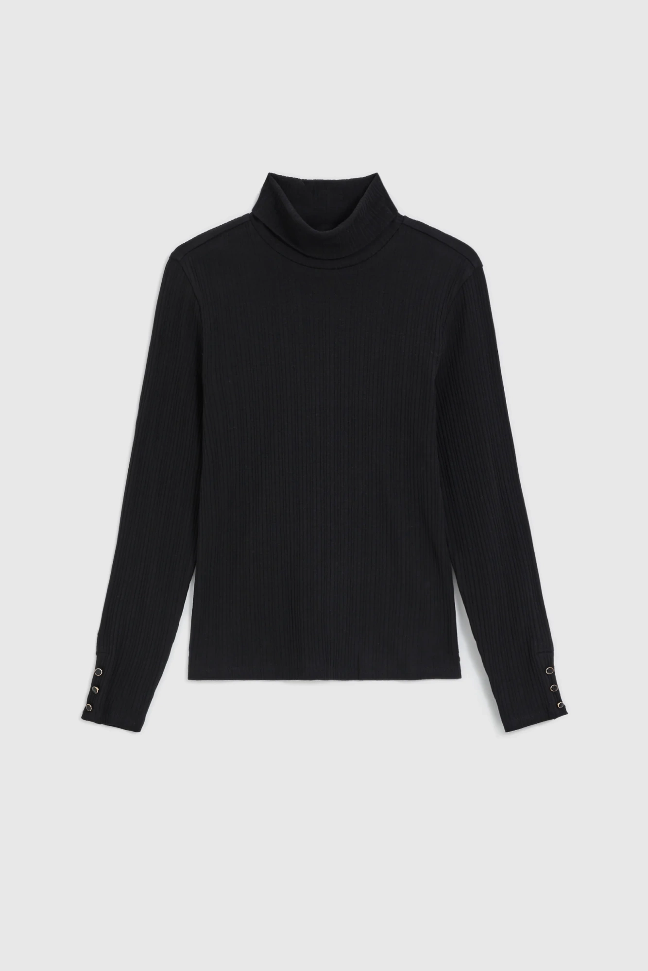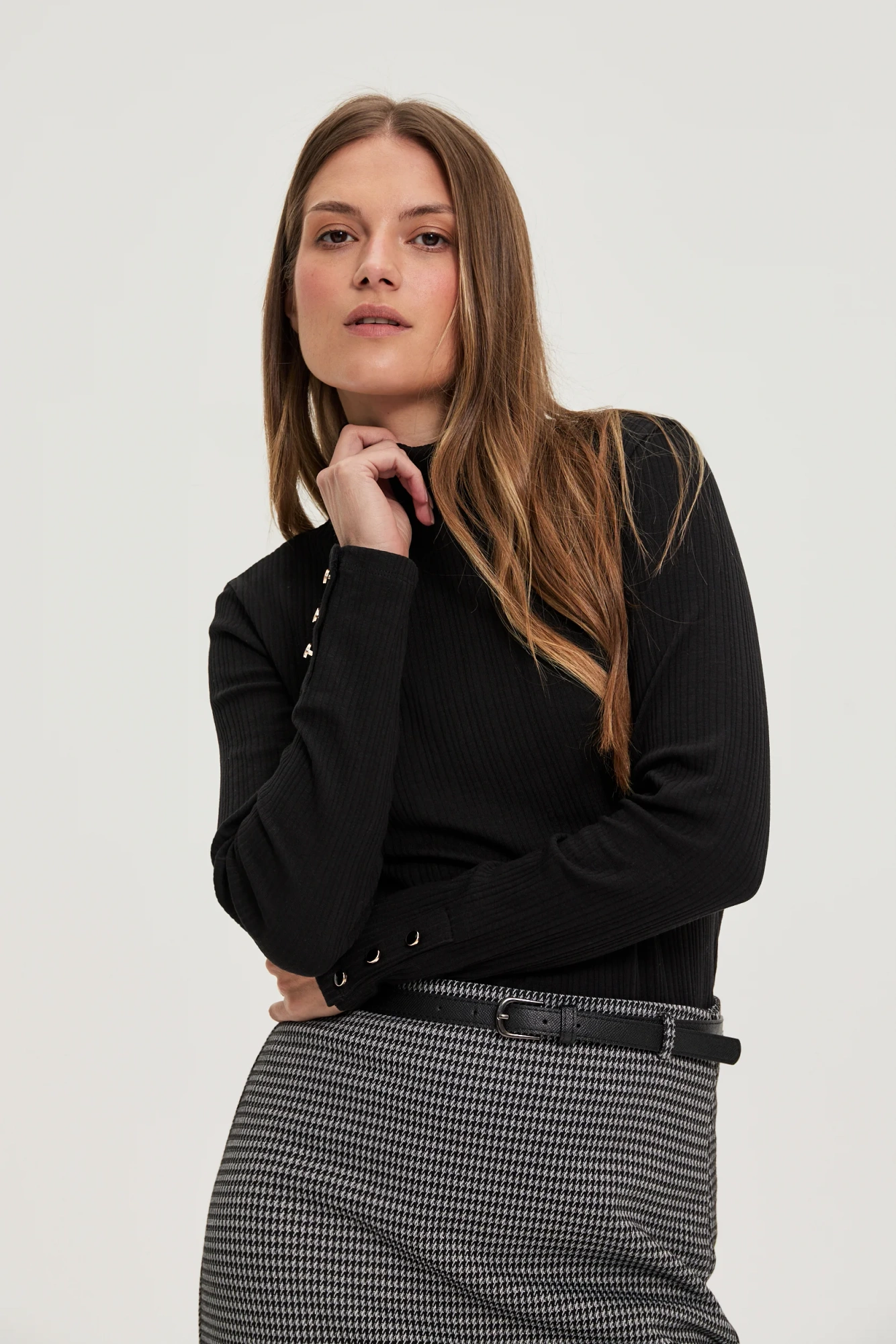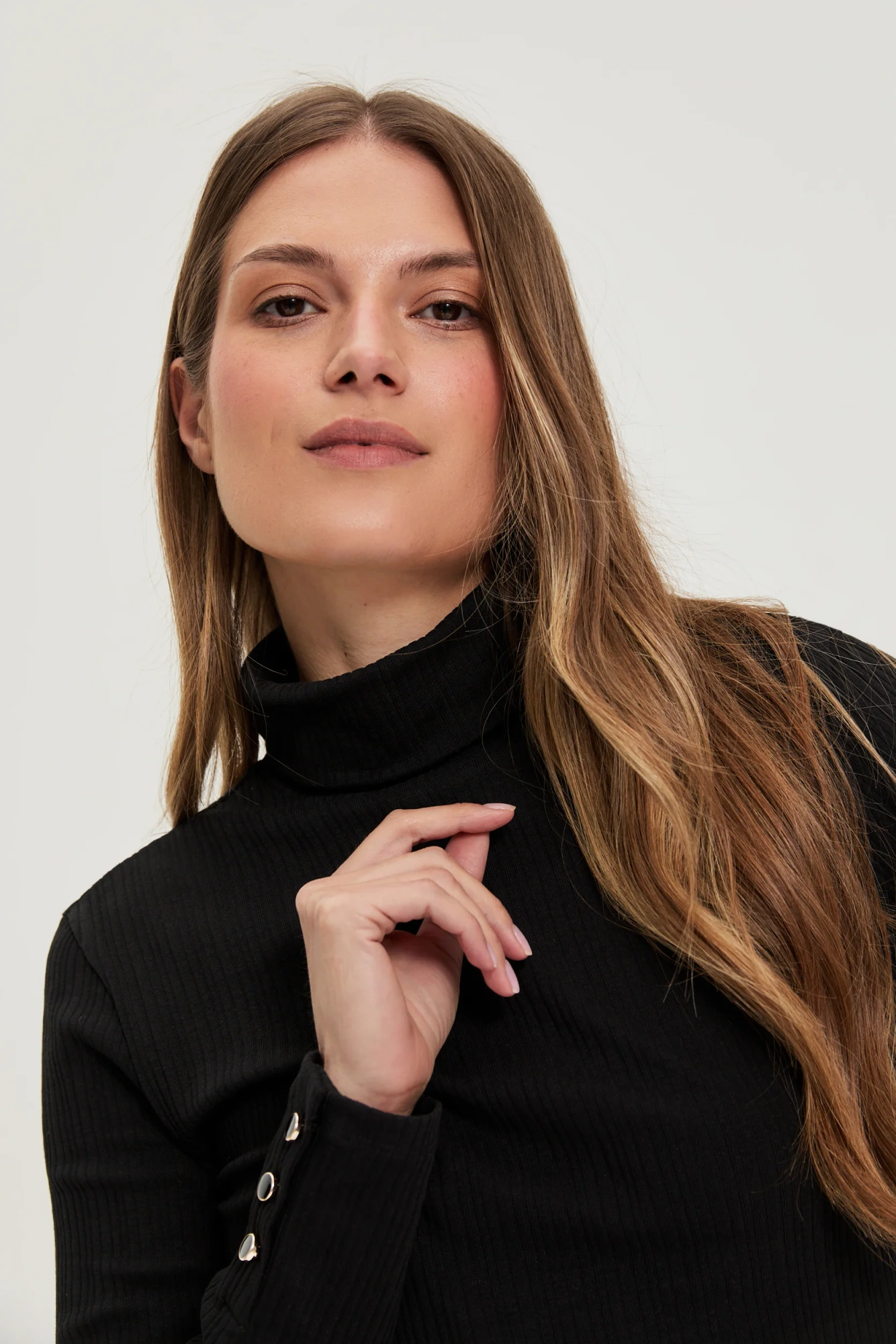 95%BAWEŁNA,5%ELASTAN Bluzka w kolorze czarnym to połączenie ponadczasowej elegancji i komfortu. Gładka faktura materiału podkreśla minimalistyczny styl, a dopasowany krój subtelnie akcentuje sylwetkę. Długi rękaw sprawia, że bluzka doskonale sprawdzi się w chłodniejsze dni, dodają całości funkcjonalności i nowoczesnego charakteru. Dekolt typu golf zapewnia wygodę oraz stylowy wygląd, chroniąc przed zimnem i delikatnie wydłużając linię szyi. Miękka tkanina z przewagą naturalnej bawełny gwarantuje uczucie świeżości przez cały dzień. Czarna bluzka bez wzoru to idealny wybór zarówno do pracy, na spotkania biznesowe, jak i na wieczorne wyjście. Świetnie komponuje się z materiałowymi spodniami, ołówkową spódnicą czy klasycznymi jeansami. Sprawdzi się w zestawieniu z żakietem lub długim kardiganem, tworząc stylizacje na wiele okazji, od formalnych po casualowe.