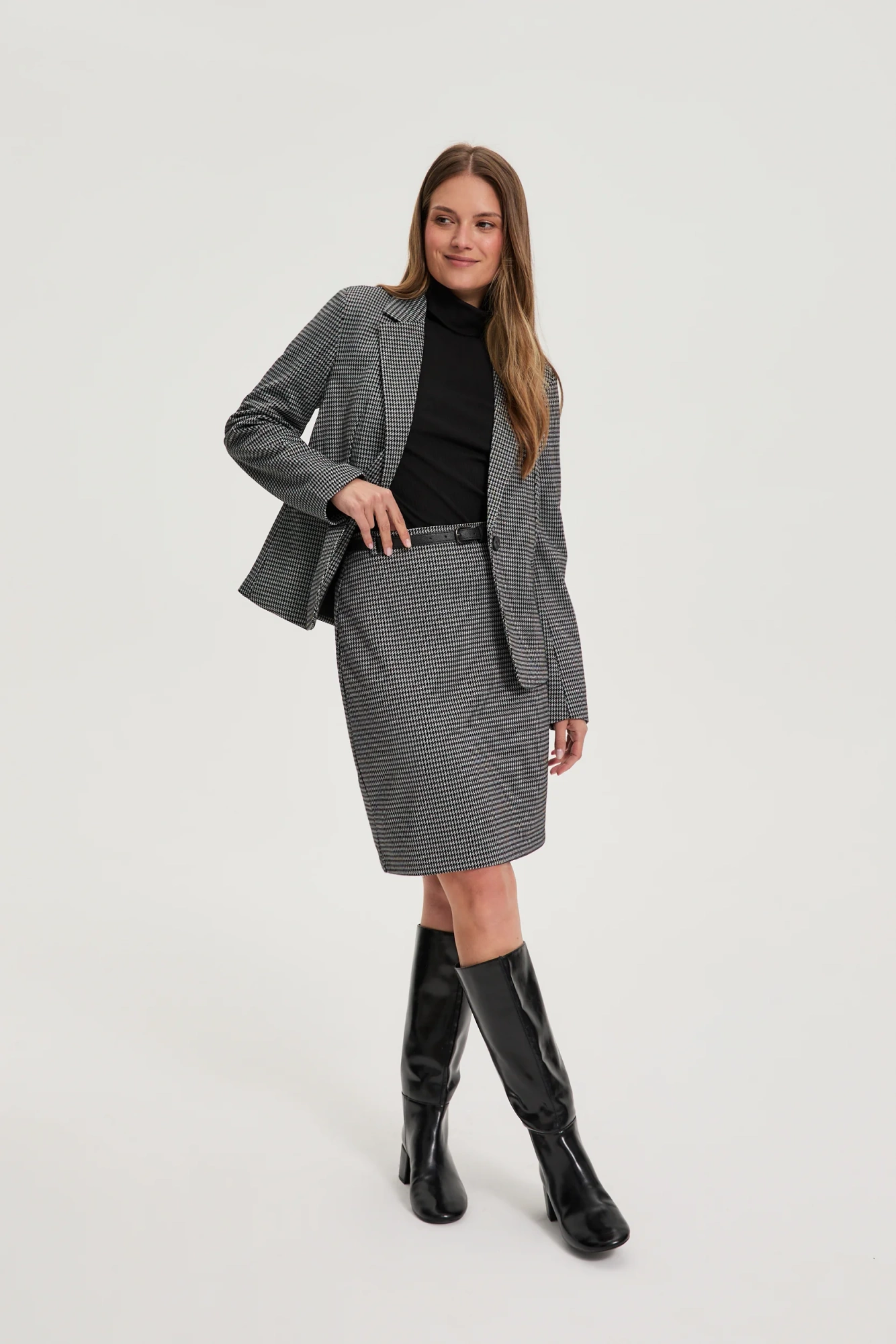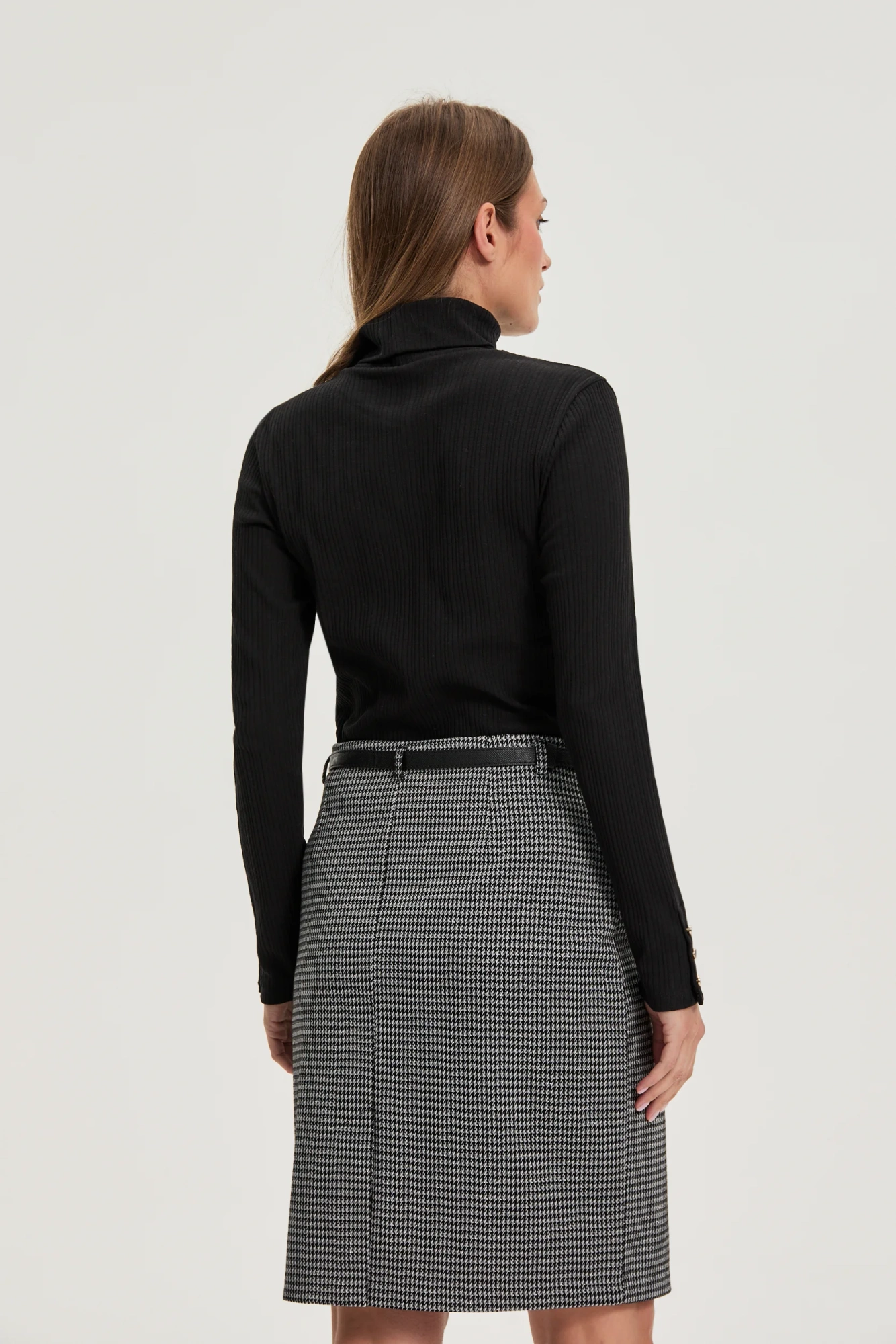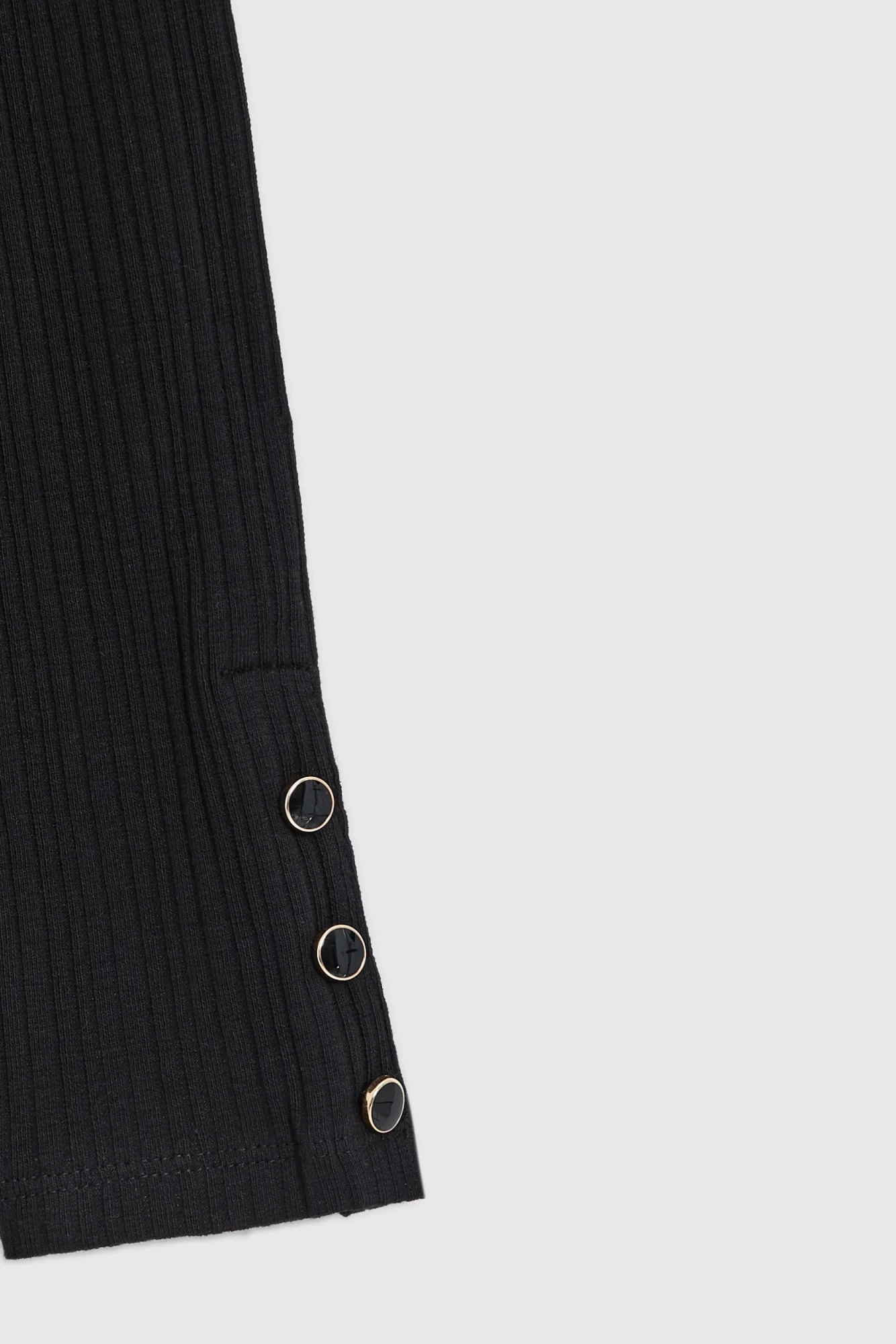 95%BAWEŁNA,5%ELASTAN Bluzka w kolorze czarnym to połączenie ponadczasowej elegancji i komfortu. Gładka faktura materiału podkreśla minimalistyczny styl, a dopasowany krój subtelnie akcentuje sylwetkę. Długi rękaw sprawia, że bluzka doskonale sprawdzi się w chłodniejsze dni, dodają całości funkcjonalności i nowoczesnego charakteru. Dekolt typu golf zapewnia wygodę oraz stylowy wygląd, chroniąc przed zimnem i delikatnie wydłużając linię szyi. Miękka tkanina z przewagą naturalnej bawełny gwarantuje uczucie świeżości przez cały dzień. Czarna bluzka bez wzoru to idealny wybór zarówno do pracy, na spotkania biznesowe, jak i na wieczorne wyjście. Świetnie komponuje się z materiałowymi spodniami, ołówkową spódnicą czy klasycznymi jeansami. Sprawdzi się w zestawieniu z żakietem lub długim kardiganem, tworząc stylizacje na wiele okazji, od formalnych po casualowe.