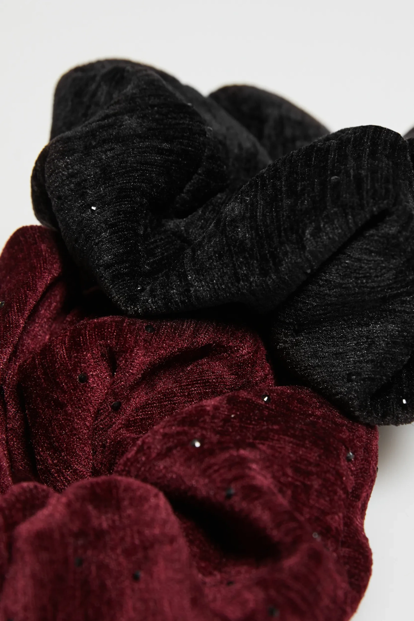 100% POLIESTER Zestaw dwóch gumek do włosów. Jednak w kolorze burgundowym, druga w czarnym.