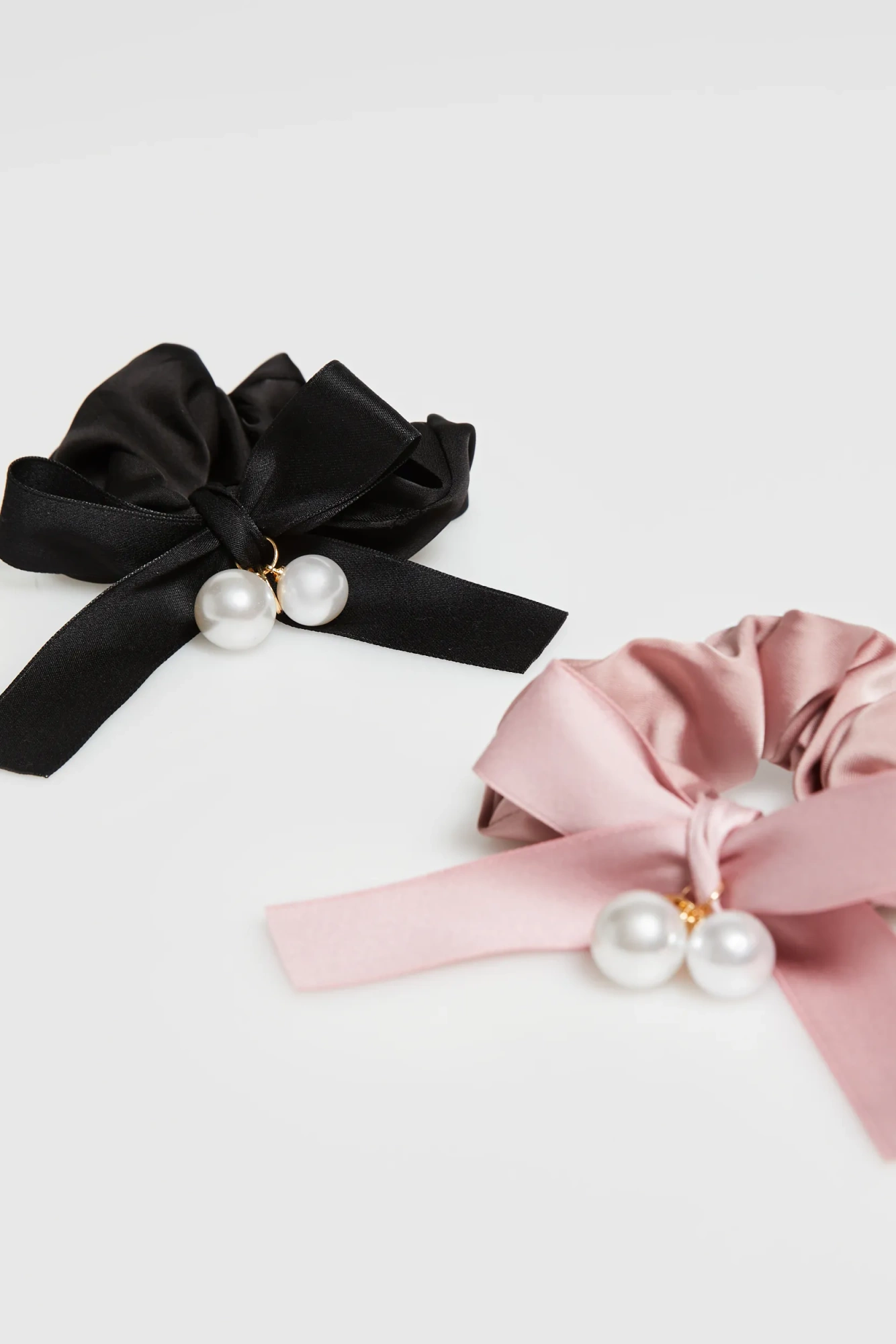 100% POLIESTER Zestaw dwóch gumek do włosów. Ozdobione wstążką i koralikami. Jedna z nich w kolorze różowym, druga w czarnym.