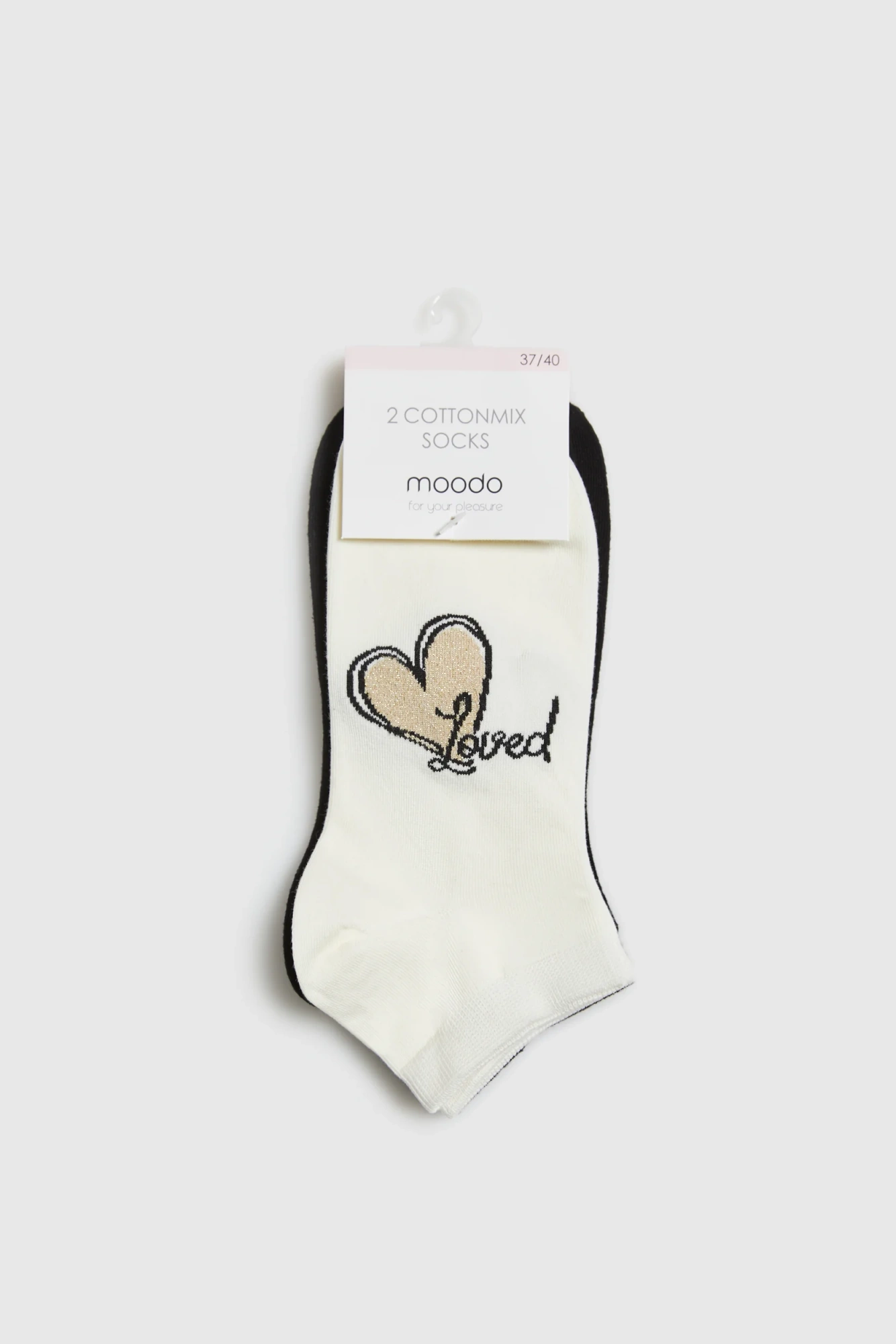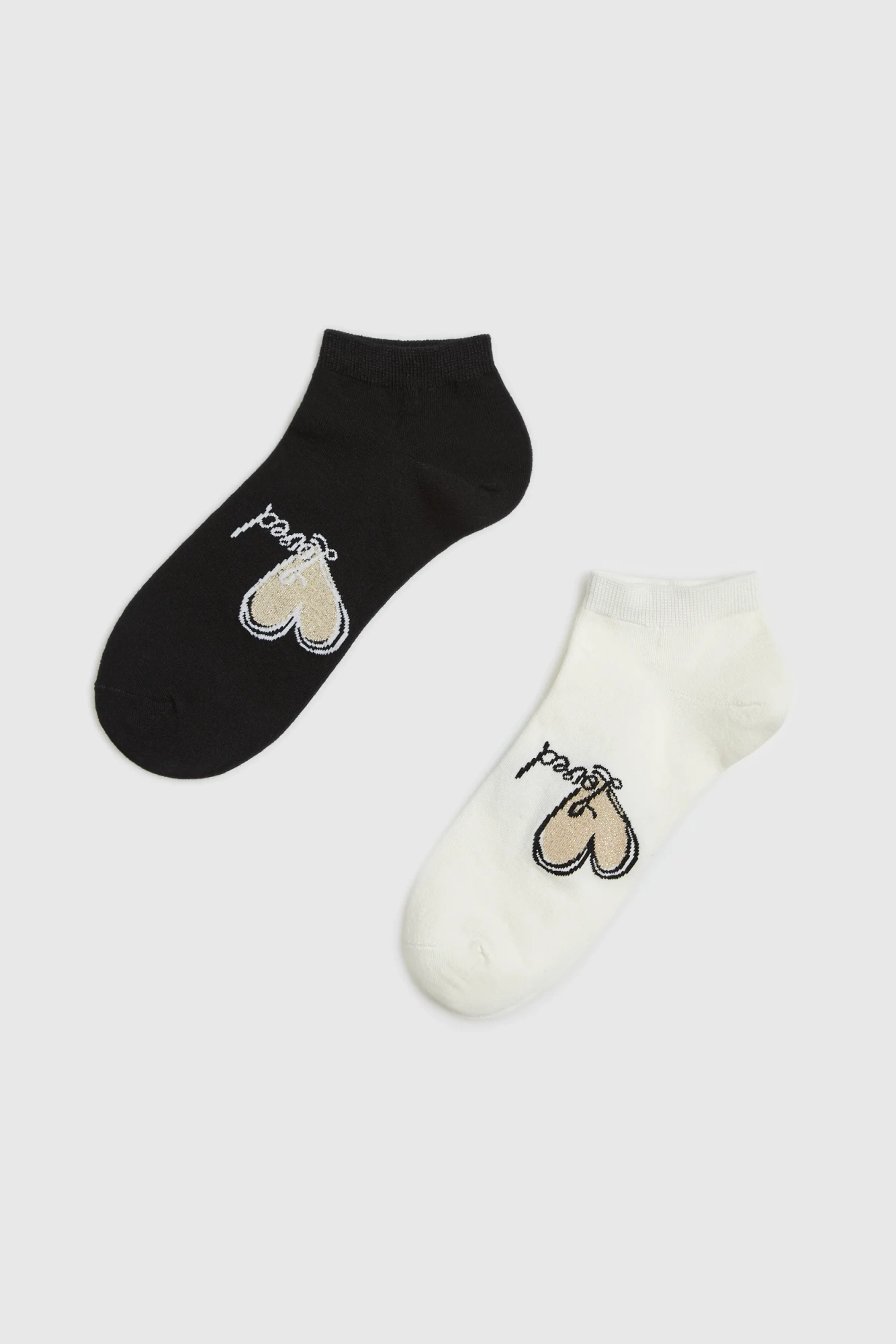 63,3% BAWEŁNA 33,8% POLIESTER, 2,9% ELASTAN 2-pack skarpetek w kolorze czarnym i białym. Ozdobione nadrukiem serca i napisem.