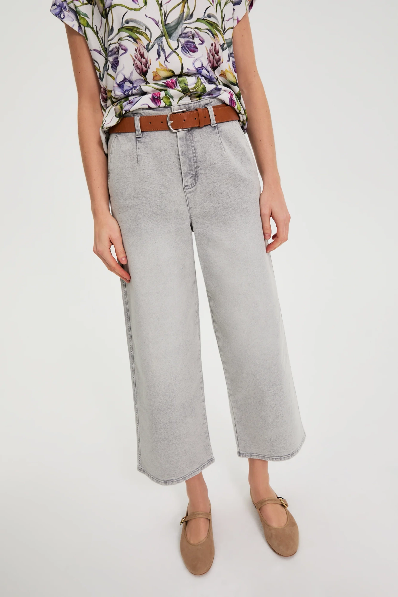 98%BAWEŁNA, 2%ELASTAN Jeansy wide leg w odcieniu ponadczasowej szarości to propozycja dla kobiet, które cenią swobodę ruchów i nowoczesny styl. Gładka, miła w dotyku bawełna zapewnia komfort przez cały dzień, a klasyczny zamek i długość 7/8 dodają całości lekkości. Modny fason z szeroką nogawką pozwala podkreślić sylwetkę, nie rezygnując z wygody ani kobiecego charakteru stylizacji. Idealne na spotkanie z przyjaciółmi, do pracy czy na spacer po mieście. Jeansy doskonale prezentują się zarówno z elegancką marynarką i butami na obcasie, jak i z prostym T-shirtem oraz sneakersami. Uniwersalny kolor sprawia, że łatwo je zestawić z ulubioną koszulą, swetrem lub letnim topem. To codzienna baza, która pozwala na tworzenie niezliczonych, stylowych kombinacji, zawsze w duchu miejskiej wygody i kobiecej pewności siebie.