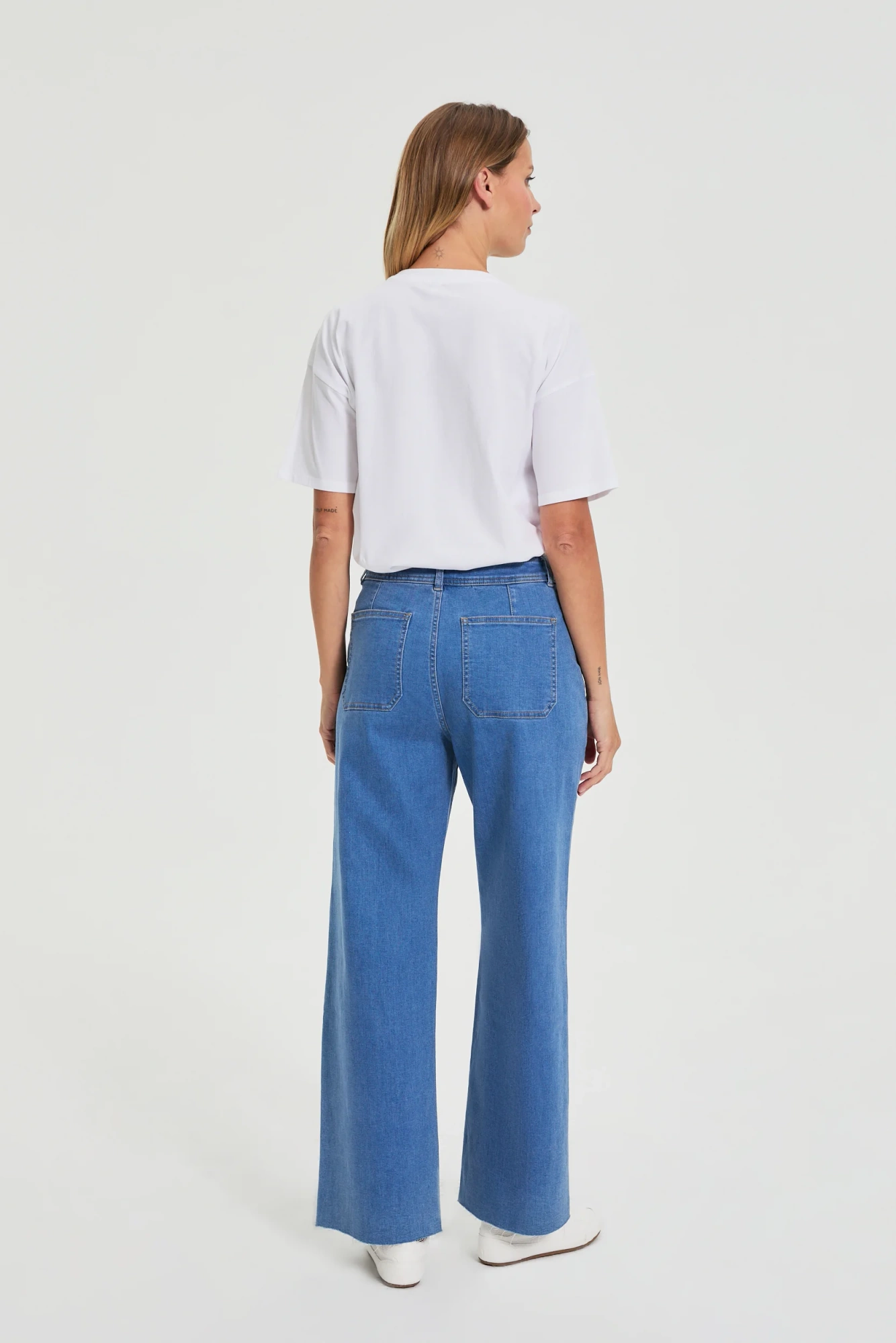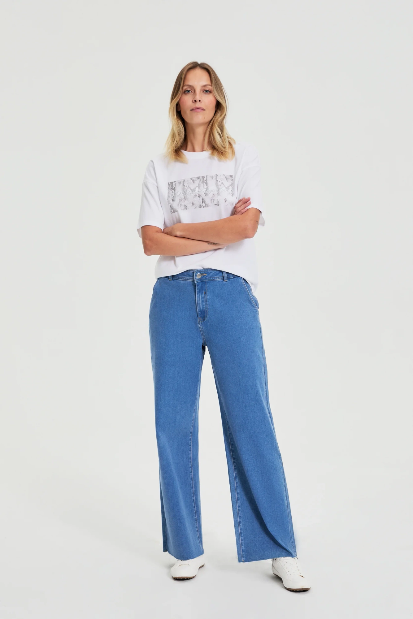 71%BAWEŁNA, 27%POLIESTER, 2%ELASTAN Jeansy wide leg to propozycja dla kobiet, które lubią łączyć wygodę z modnym stylem. Komfortowy fason z szeroką nogawką zapewnia swobodę ruchów, a miękka, przyjemna w dotyku bawełna sprawia, że model świetnie sprawdza się na co dzień. Gładka, niebieska tkanina bez wzorów podkreśla uniwersalny charakter jeansów. Długość do kostek i klasyczne zapięcie na zamek sprawiają, że spodnie łatwo dopasować do różnych sylwetek i stylizacji. Jeansy wide leg dodają stylowego wyrazu codziennym lookom, a jednocześnie wpisują się w najnowsze trendy. Sprawdzą się na spotkanie z przyjaciółmi, wyjście do miasta czy relaksującą kawę po pracy. To must-have w garderobie każdej aktywnej kobiety ceniącej komfort, nowoczesność i uniwersalność.