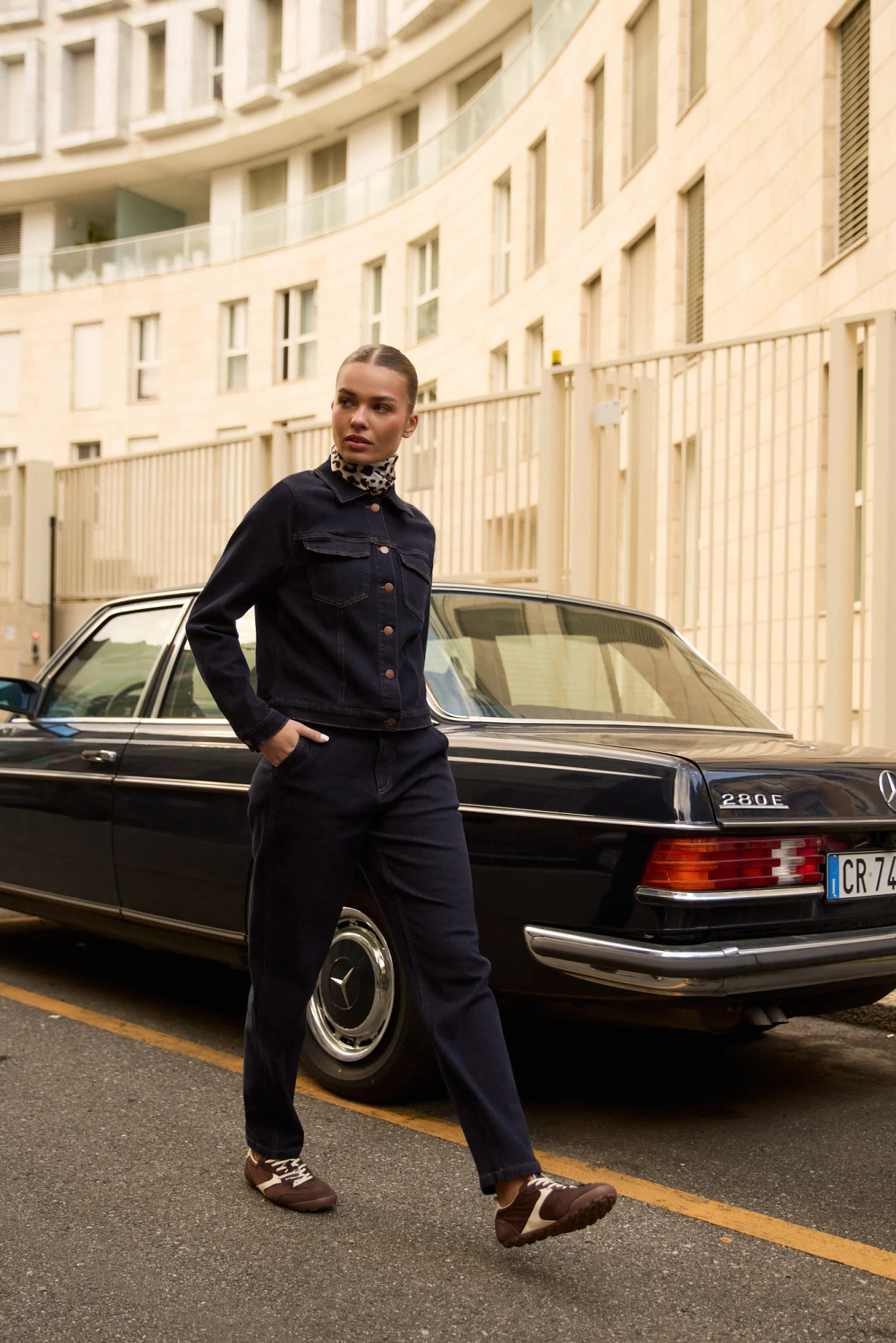 68%BAWEŁNA, 30%POLIESTER, 2%ELASTAN Jeansy chino w odcieniu granatu to propozycja stworzona z myślą o aktywnych kobietach, które kochają wygodę i swobodę ruchu. Miękka bawełniana tkanina zapewnia komfort przez cały dzień, a klasyczny fason z długą nogawką i praktycznym zamkiem podkreśla nowoczesny, miejski styl. Gładka, pozbawiona wzorów powierzchnia sprawia, że spodnie doskonale wpisują się w codzienny dress code, jednocześnie pozostając uniwersalną bazą w garderobie. Idealne na dzień w pracy, szybkie spotkanie z przyjaciółmi czy weekendowy spacer po mieście. Jeansy chino świetnie komponują się zarówno z elegancką koszulą i marynarką, jak i z luźnym t-shirtem czy swetrem. Modny, kobiecy krój sprawia, że sylwetka zyskuje lekkości, a stylizacja pozostaje swobodna i stylowa. To must-have, który łączy komfort z codzienną elegancją i pozwala czuć się pewnie w każdej sytuacji.